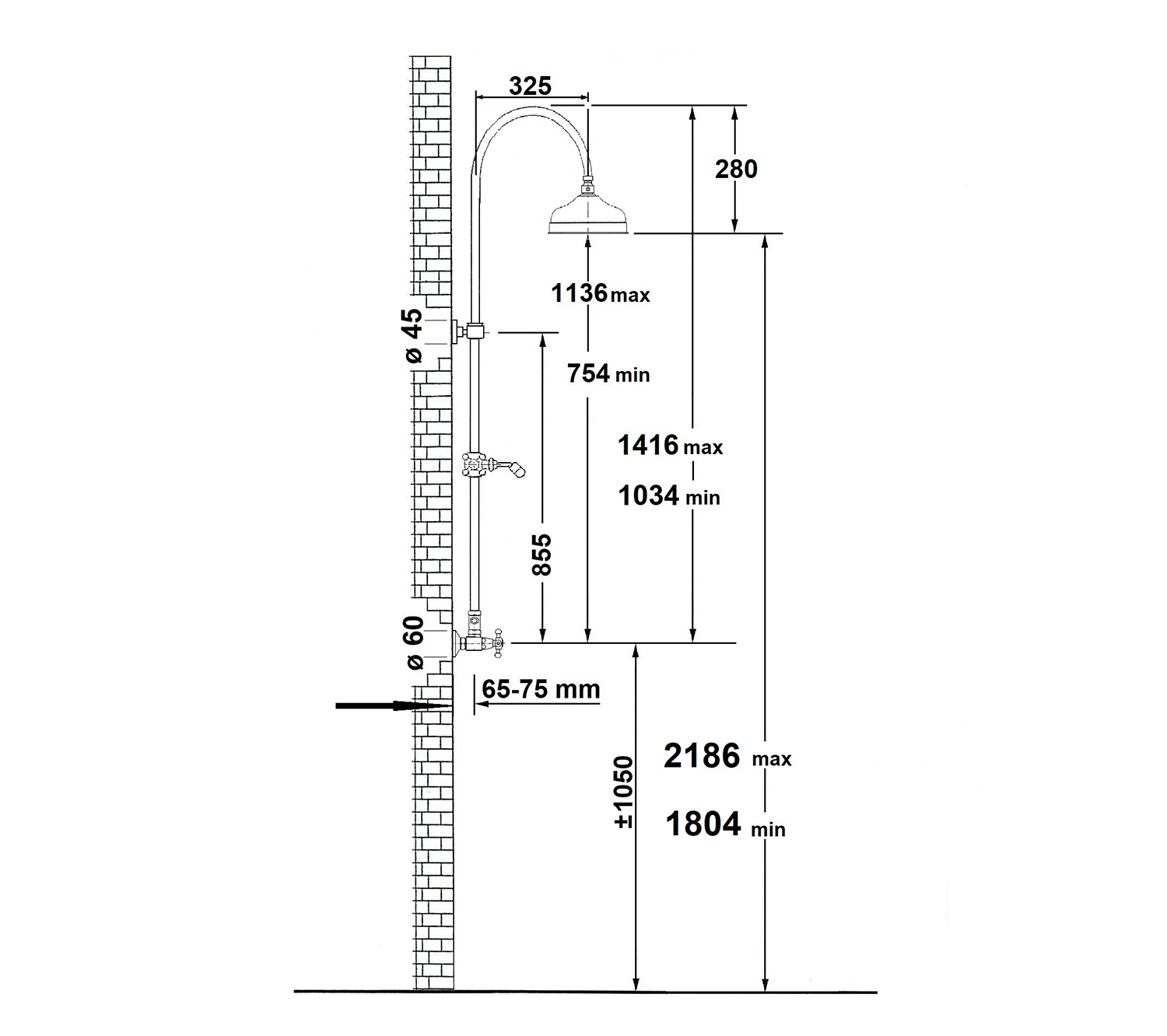 - teleskopowy drążek prysznicowy z deszczownią o średnicy 200 mm; regulacja wysokości drążka od 1100 do 1400 mm