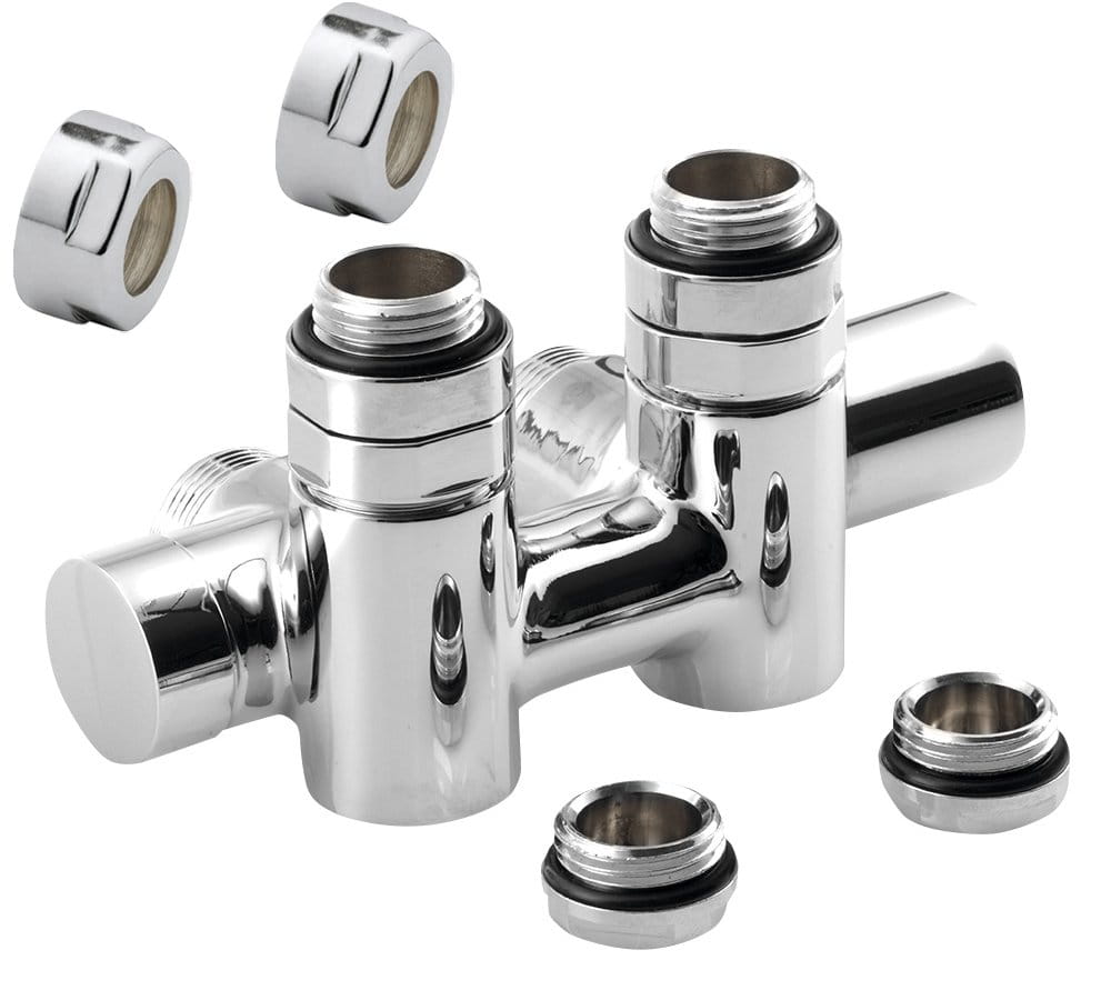 Zestaw przyłączeniowy do grzejników w kolorze chrom. Ogrzewanie centralne i elektryczne. Podłączenie środkowe, rozstaw podłączenia 50 mm.